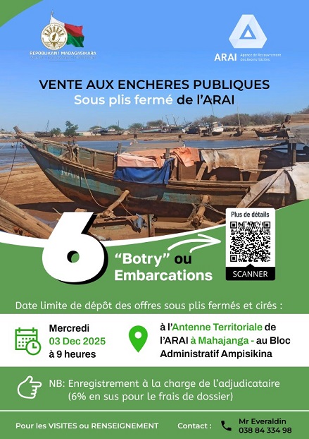Le public est informé que le mercredi 03 décembre 2025 à 9 heures, il sera procédé à l'Antenne territoriale de l'Agence de Recouvrement des Avoirs Illicites sise au Bâtiment Administratif Ampisikina Mahajanga,
