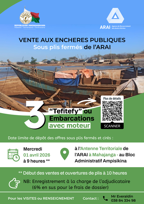 L’Agence de Recouvrement des Avoirs Illicites (ARAI) lance une vente aux enchères publiques sous plis fermés, portant sur 3 embarcations ou “Tefitefy” avec moteur conservées à l’Antenne Territoriale de Mahajanga